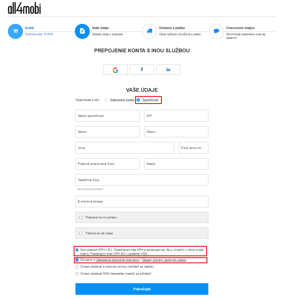 Internetový obchod All4mobi S.A. prevádzkuje poľská spoločnosť so sídlom vo Varšave. Ak ste platiteľom DPH v inej krajine ako v Poľsku, je potrebné, aby bol váš nákup znížený o sumu DPH. Jediné, čo musíte urobiť pri zadávaní údajov, je prečítať si a schváliť zmluvné podmienky a zásady ochrany osobných údajov a zaškrtnúť nasledujúce políčka: