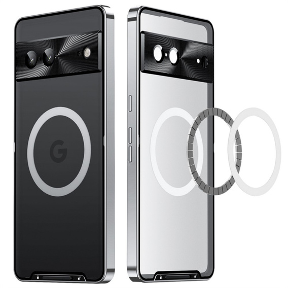 Ochranné puzdro na fotoaparát pre Google Pixel 8, CamShield MagSafe, priehľadný / strieborný je elegantné puzdro s vysokými ochrannými vlastnosťami. Konštrukcia vyrobená z pružného TPU a tvrdého, pevného kovu zaručuje spoľahlivú ochranu bokov a zadnej strany telefónu.